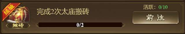 打开“日常”界面找到“搬砖”点击前往,自动寻路到本国王城太庙接取搬砖任务,前往敌国太庙进行搬砖;