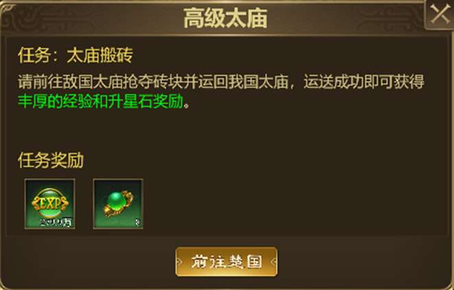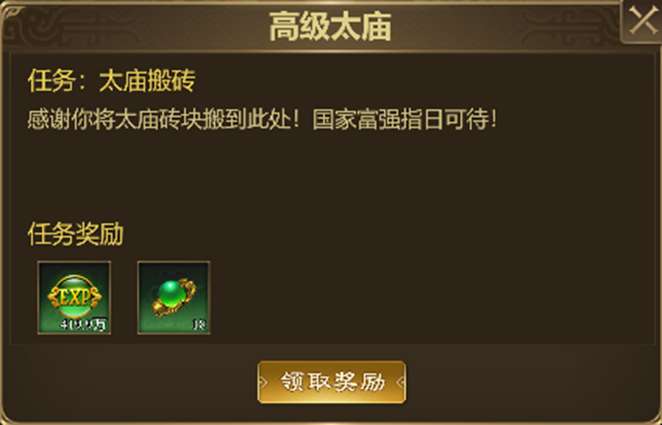 玩家在敌国太庙搬完砖或换完砖后,点击“交付任务”将自动寻路至本国太庙,玩家点击“领取奖励”后即完成任务获得奖励;