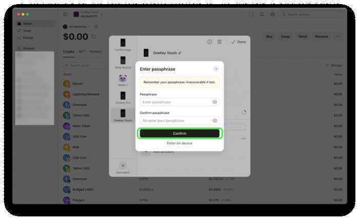 以下介绍了如何在 OneKey 钱包上分步启用密码短语功能。