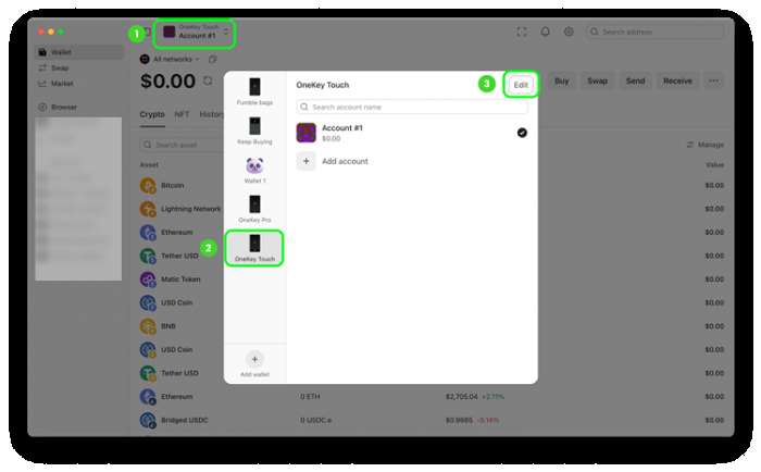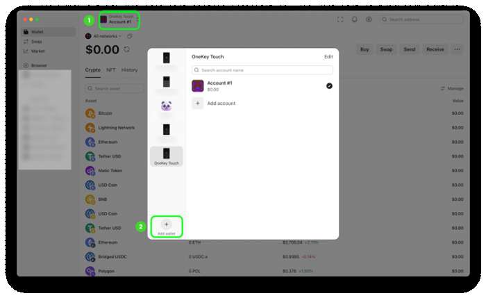 打开 OneKey App。点击账户名称并选择 '添加钱包'。