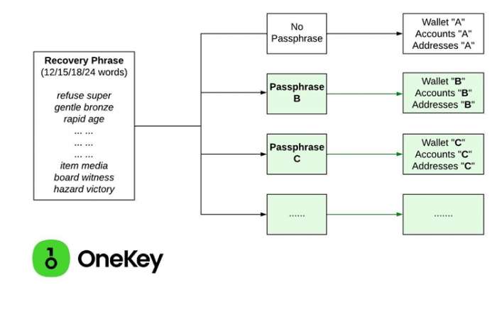 本质上,它是一个由用户定义的字符字符串,当它与恢复短语结合使用时,会创建一个唯一的钱包。这意味着即使有人获得了你的恢复短语,他们仍然需要密码短语才能访问你的资金。密码短语可以是任何你选择的内容,如单词、句子或字符组合,这使其高度可定制且难以被破解。