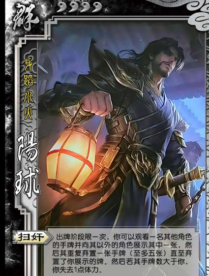 软件提交 专题合集 热门手游三国杀赛事专属武将阳球,技能扫奸:出牌阶段限一次,可观看一名其他角色手牌并选一张,队友可重复弃牌直至弃掉目标该牌(最多五次),之后若目标手牌数大于你,你失去1点体力。台词展现其嫉恶如仇、肃清朝纲的刚烈形象。