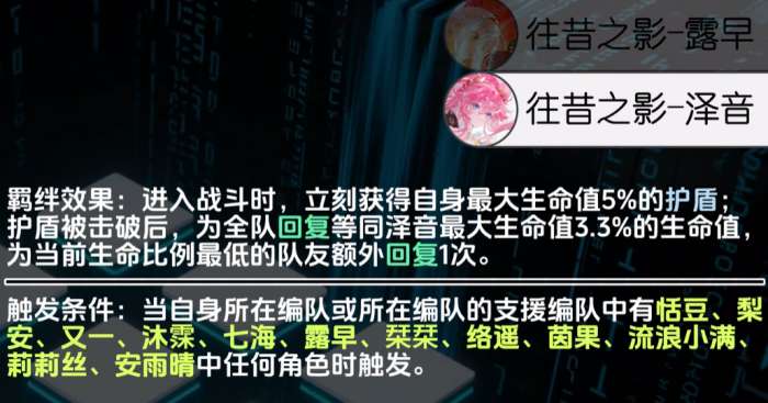 现在大家想用泽音来组建阵容的话,这里推荐她一起配队的还有柚恩+露早,其中的泽音作为辅助,她可以触发一个往昔之影的羁绊,这个羁绊的能力是在刚开始进入战斗时就可以触发的,此时泽音会获得根据自己最大生命值5%的数值放出来的护盾,这个护盾会抵御敌人的攻击,只要是护盾被敌人击破,那么泽音就会给全队都带来一个回复的效果,且根据生命数值最低的一个队友带来额外的回复次数,这样血线有了泽音的技能保障,加上柚恩以及露早的输出就不用担心阵容强度啦。