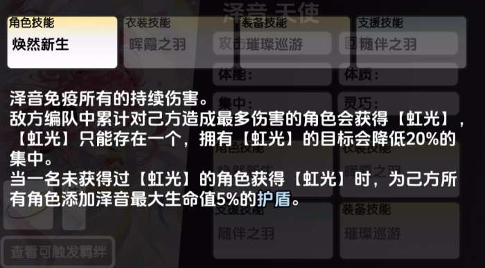 泽音的角色技能叫做焕然新生,使用的时候泽音会免疫对面带来的所有持续伤害,而且会在敌方编队中累计对己方造成最多伤害的角色带来一个负面影响,此类敌人身上会获得一个【虹光】状态的影响,虽然是一个负面的影响但是【虹光】只能存在一个,不能叠加,一般拥有【虹光】状态影响的目标会降低20%的集中。,当一名未获得过【虹光】的敌人第一次获得【虹光】影响时,还会为己方所有角色添加泽音最大生命值5%的护盾进行防御。