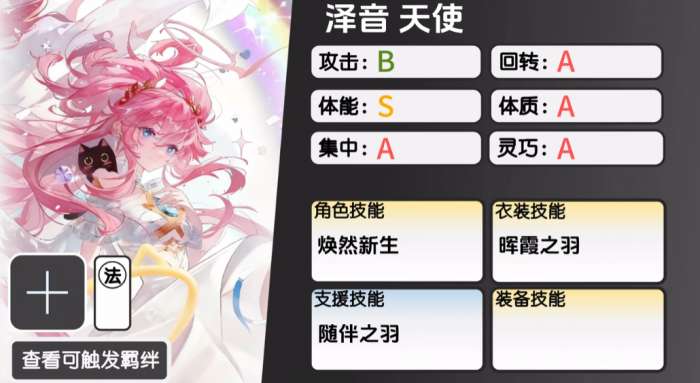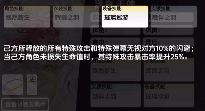 泽音的装备技能可以选择璀璨巡游,这个技能的效果会让己方所释放的所有特殊攻击和特殊弹幕无视对方10%的闪避当己方角色未损失生命值时,带来的特殊攻击暴击率提升25%,最后再支援技能上面泽音可以用的就是随伴之羽这个技能,这个技能是当己方首次有角色生命值降低至一定百分比的时候,会为为这个角色回复其最大生命值的5%,当然这里生效的百分比还是比较多的,比如95%以及60%以下的时候可以触发,还有30%以及5%以下时也可以触发这个回复效果。