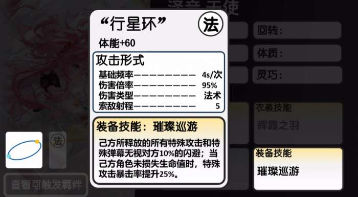 泽音作为游戏中一个泛用性很强的辅助角色,本身在生存拐的同事还可以带来回血的能力,且在补盾效果上面也很适合一些只有输出的阵容使用,目前她的定位是防辅,所以可以为她搭配行星环,有这个搭配的话泽音在体能上面会有60的提升效果,而在基础频率上面变成了4s/次,输出频率更快的同时伤害倍率也有所提升,这里达到了95%的数值,虽然比输出角色的倍率差了很多,但是毕竟是一个辅助定位的角色,所以也是可以接受的,其次是在法术类型的伤害上面还有一个索敌的射程,这里数值是达到了5,所以远程输出效果也是挺好的。