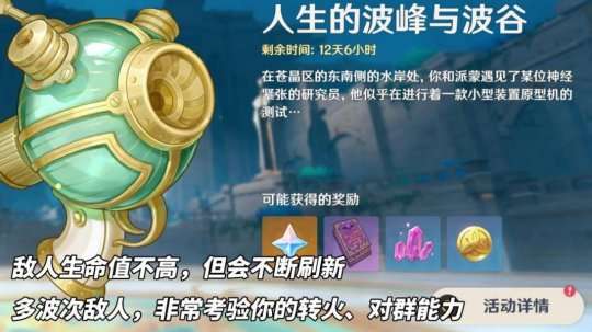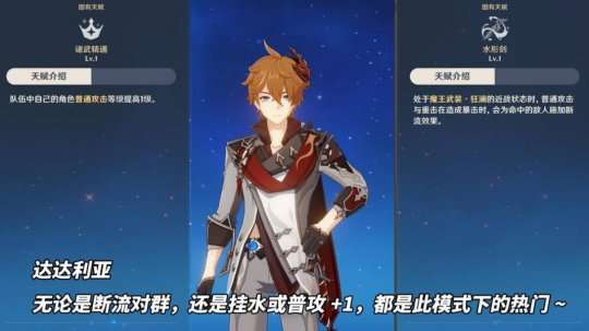 达达利亚是对群好手。她善于利用断流机制,在小怪密集的场景下,可以造成很高的伤害,成为历届割草活动中的顶尖选手。此外,她还有很强的辅助能力,可以帮助队友挂水,还能提升普通攻击等级,是该模式下的不二选择。
