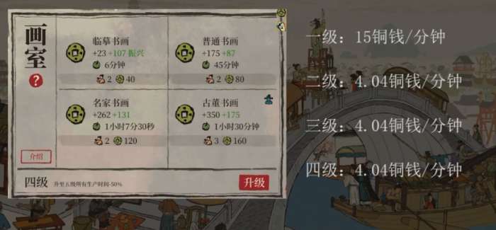 画室收益优先级跟水井基本一致,也是临摹书画的收益最高,不过相比于水井恐怖的性价比来说要稍微低调了些,仅有三倍收益。不过整体收益还是非常不错的。