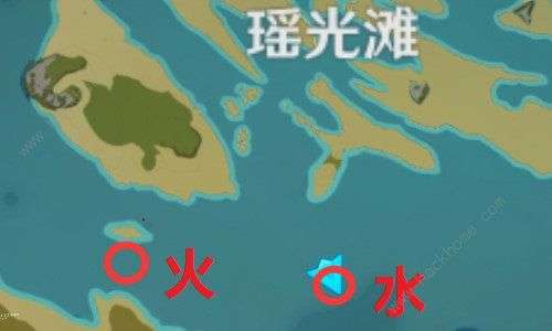 瑶光滩水下柱子的位置就是如下的图中的,这个就是两个元素的位置,一个火元素的,另一个就是水系元素的;