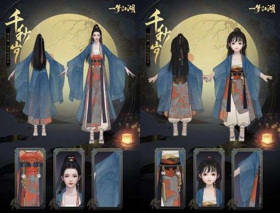 穿着“千秋岁”时装的成女高高束起了长发,发丝自然垂下,清爽又干净利落的衣身裁剪既能衬托出成女修长的腰身,大方利落的气质中又透露着些许的书卷气息。少女款式的“千秋岁”则挽起了秀气玲珑的发髻,齐眉的轻薄空气刘海,显露出小女侠们俏皮灵巧的气质。