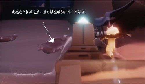 拿到第三个之后,然后玩家可以在如图所示位置,先在右边点亮机关,然后坐船前往下一站。