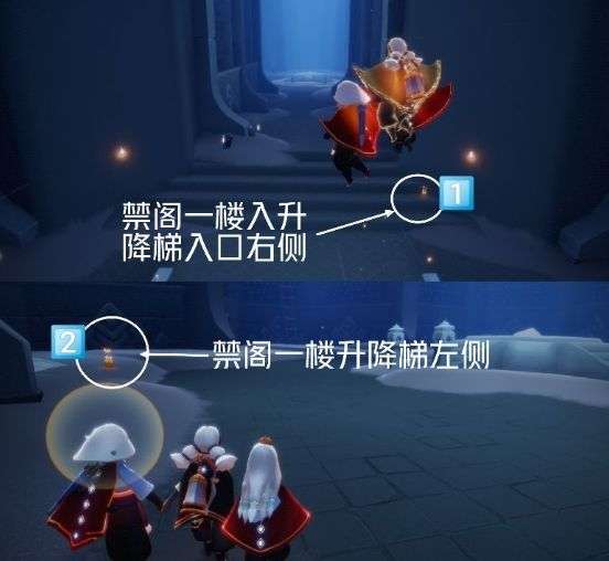 6.①禁阁一楼直走右侧可以看到;②禁阁一楼直走升降梯后面;③禁阁二楼四人门前面向升降梯左侧灯柱后面;④禁阁终点浮岛右侧。