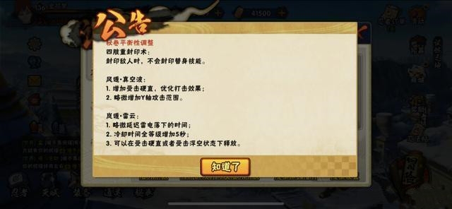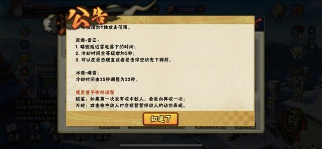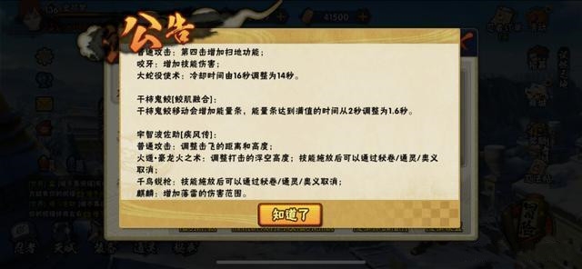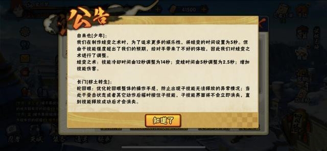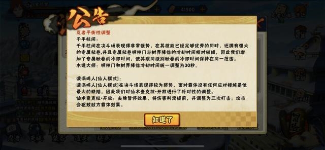忍者平衡性调整,第一个看到的是初代,但这次调整同样不是在忍者本身,还是在专属秘卷上面,之前曾经削弱了树界降临(一字连柱),加强了明神门(扦插)的效果,现在是统一调整成了30秒的CD时间,初代现在使用扦插和一字连柱都是20秒CD,所以是直接增加了10秒CD,这个调整略微有点影响。