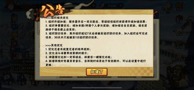 组织相关的优化中新增了跨服争霸赛的个人参与奖励以及报名全员奖励,另外还多了一个组织回归任务,希望让更多弃坑的玩家回归。