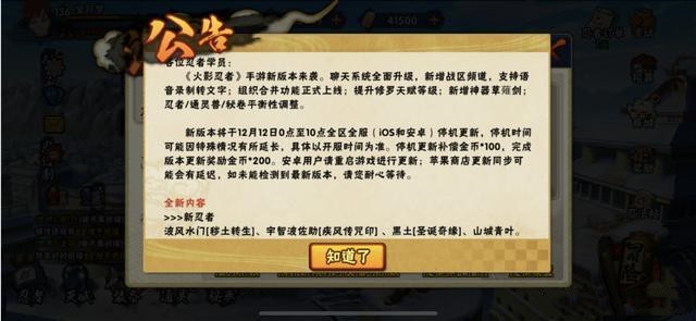 软件提交 专题合集 热门手游火影忍者手游大版本更新会在12月12日上线,服务器维护时间是12日0点-10点,关于新忍者的内容基本上都已经知道了,1月10日上架的高招S忍秽土水门,本周即将上架疾风咒印佐助,还有圣诞节期间的圣诞黑土,而山城青叶是明年2月的签到忍者。还有一些技能、武器、人物、系统方面的更改!