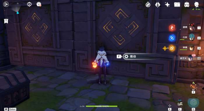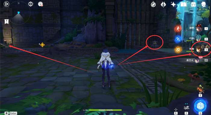 ④进入水下入口后,使用上升石板机关可以来到下个空间,这里可以看到右侧有两个需要解密的机关,左侧有一些丘丘人。击败丘丘人后进入左侧遗迹空间。