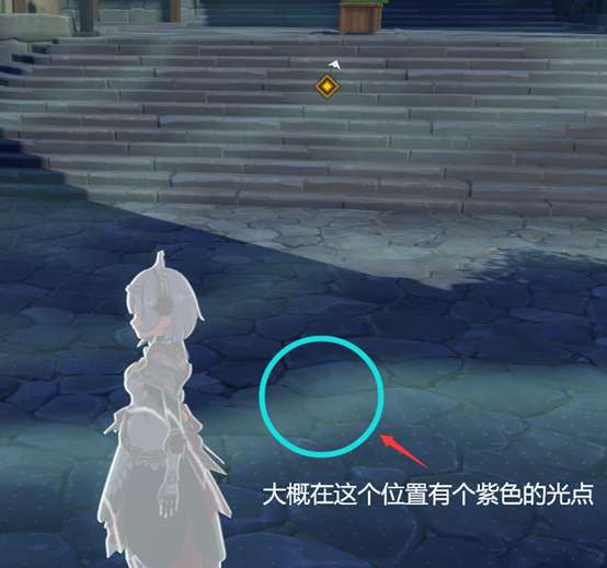 打开元素视野后,我们可以看到,在任务指引的位置会出现紫色的光点,这个就是元素痕迹了。