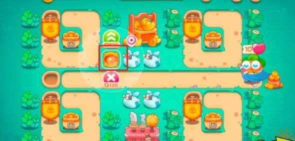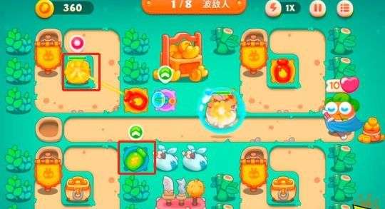 3.第三步在下排设置新炮塔,兔子快清完时让炮塔清理其他道具。
