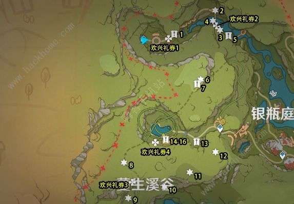 4、随后我们来到【蔓生溪谷】地区,偏南方的位置,爬到一座山的山顶就能找到欢兴礼券。