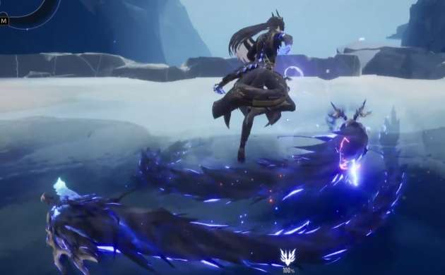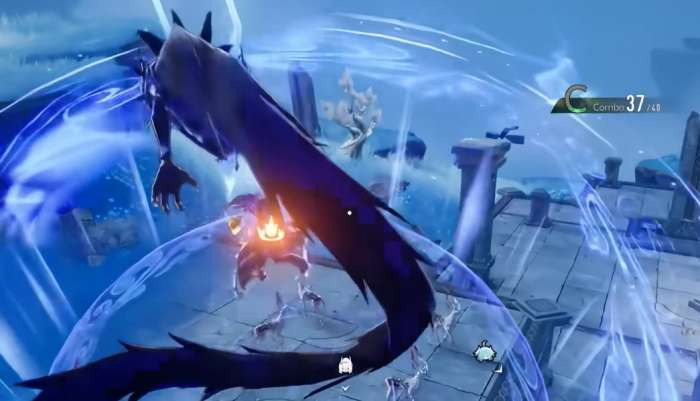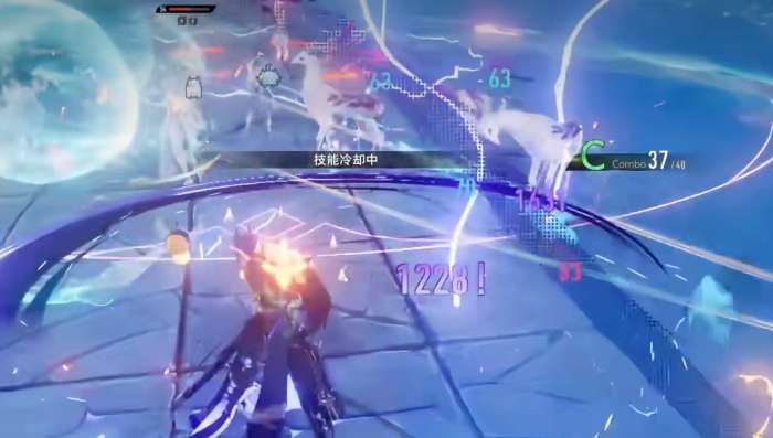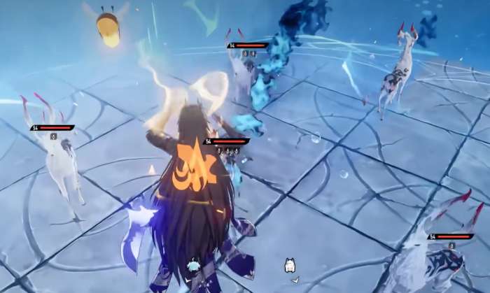 先说煜明的增益技能。释放之后,他身边的敌人会受到雷属性伤害,同时他自己会跳到空中。滞空状态下,下一次落地攻击的范围会变大,打出去覆盖的面积更广。如果这时候玄蛟已经在场上了,落地的瞬间玄蛟会跟着发动一次特殊攻击,对敌方单位追加一段雷属性伤害。两边同时打,输出叠在一起,效果很直观。这个技能的节奏感挺强的,跳起来再砸下去,配合玄蛟一起,感觉很爽。
