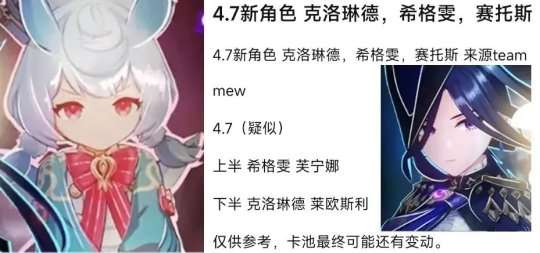 然后就是4.7卡池角色抽取的规划了,根据爆料的消息来看,4.7新五星角色是希格雯、克洛琳德,其中克洛琳德是前台雷C,目前看来,机制方面更偏向于刻晴,强度方面就不知道怎么样了,建议观望,希格雯的话是水系角色,其他消息都比较存疑,不多评价。