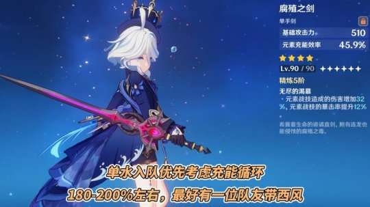 【芙宁娜】单水入队是有充能压力的,冻梨建议充能最好在180-200%左右(且队伍内最好有一把西风)。哪怕你手中有专武也下了换充能武器(水管、腐殖之类),避免为了虚假面板而丢失真实的伤害。此外,元素爆发持续时间18秒、冷却15秒,没必要提前补,完全可以在周围光效消失再上场~