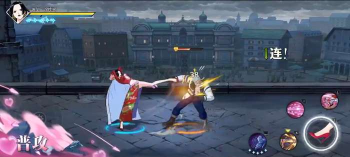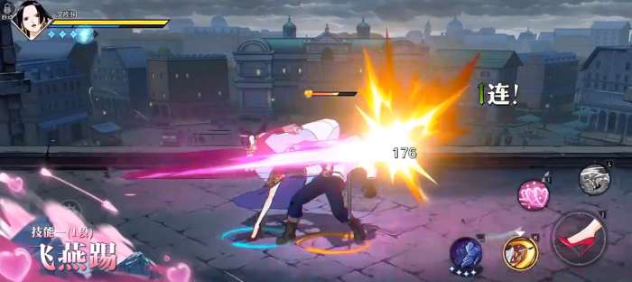 一技能名为“飞燕踢”,支持点按与长按两种释放模式。点按时分为三段:首段为直线飞踹,二段为斜上方向旋转踢击,三段为空中高弹腿下劈,具备抓取判定;长按则激活果实能力融合机制,消耗额外精力值,全面提升各段攻击性能。