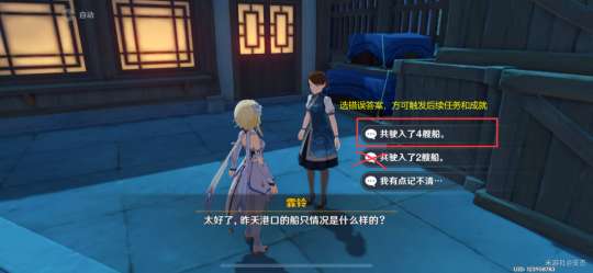 对话得知,霖铃正在数昨日的船只,因为写诗耽误了,而且她对数船工作一点也不上心,还叫我们帮忙数,告知我们可以通过港口的三个小孩获知信息
