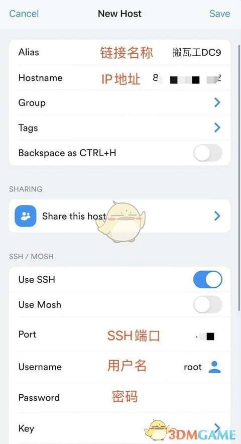 2、这个页面需要输入连接名称和连接信息,这里以搬瓦工VPS为例,填入连接名称(随便填)、VPS的IP地址、SSH端口、用户名(一般是root)和root密码,模式选择“SSH”,之后点击“Save”保存设置: