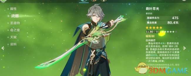 属于单手剑类型,在普攻造成元素伤害可以增加普攻以及元素战技的伤害,为艾尔海森提供额外的输出。