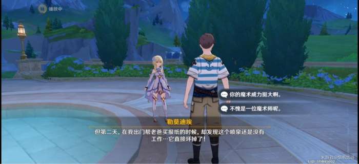 与停运的喷泉交互后进入对话,在与勒莫迪埃的对话中得知他给他妹妹表演了一个喷泉停运的“魔术”,结果喷泉真的停止工作了