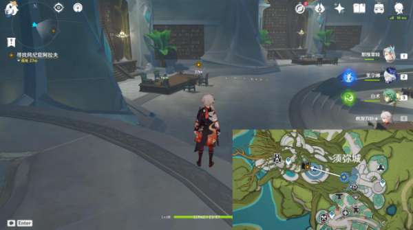 2、之后跟随赛诺进入教令院,在喷泉后面的比值与赛诺对话;