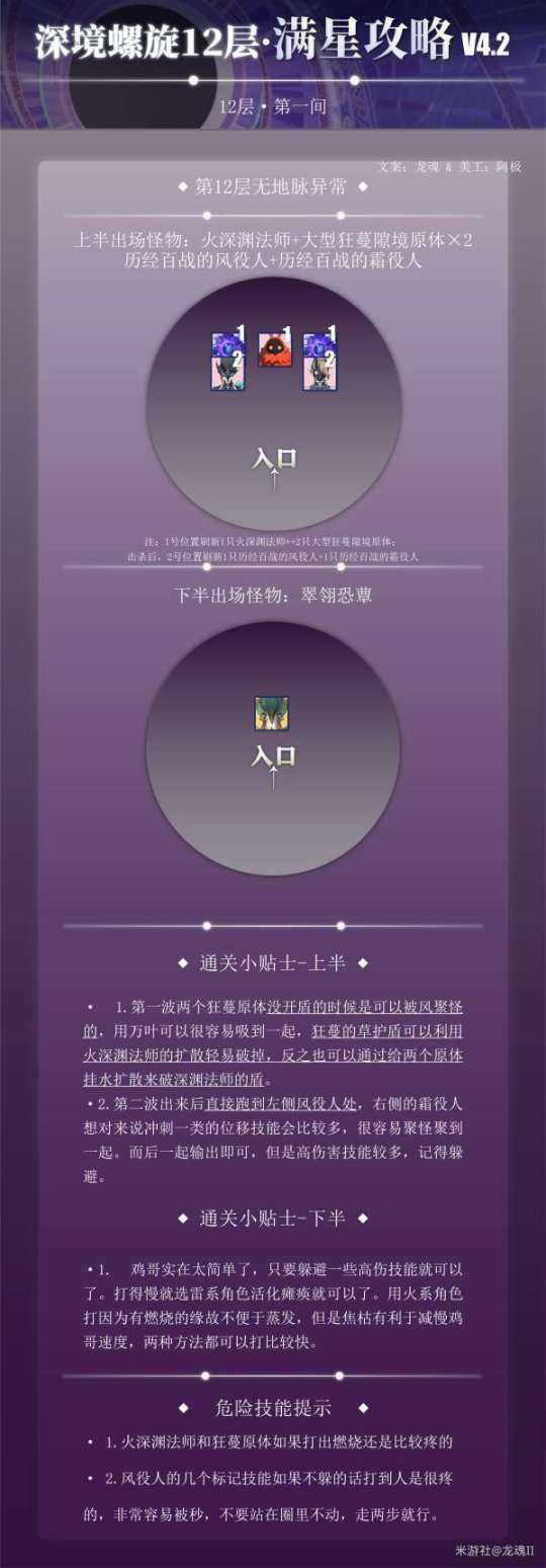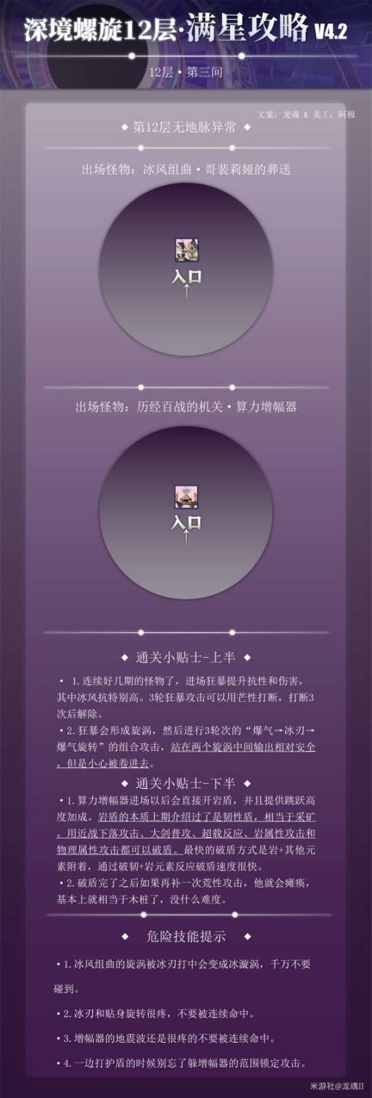 本期深渊基本可以按照4.2深渊的打法来,上半区域只是换了个冰风组曲上去,稍微增强了一下对单体的伤害,但总体上整个上半区域仍靠对群体进行AOE输出。需要注意的是,因为12-2区域有雷、草、火、飘浮和灵系怪物,12-3区域的怪物具有抵抗冰和风属性的能力,因此一些阵容的输出可能会受到一些限制。