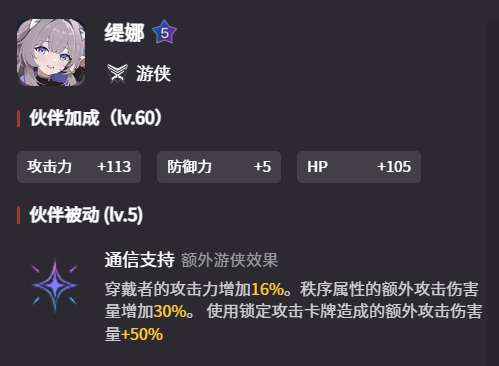 除了主战员,辅战员中也有一些角色能够提供额外攻击的伤害增幅。比如缇娜,她作为一个五星辅战员,其被动“通信支持”不仅可以使穿戴者增加16%的攻击力,还能使秩序属性的角色提升30%的额外攻击伤害量。此外,她还可以让锁定攻击卡牌所造成的额外攻击伤害量提升50%,可以说是十分适配雨果的属性和技能组。将他们两个搭配在一起可以让队伍的输出获得质的提升。