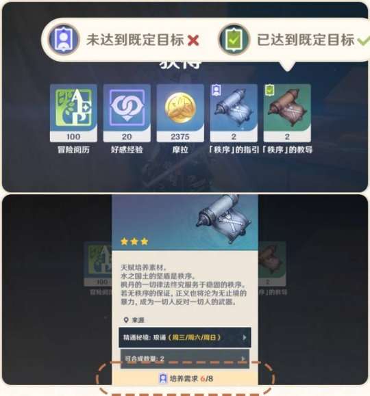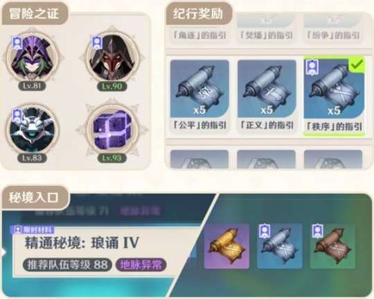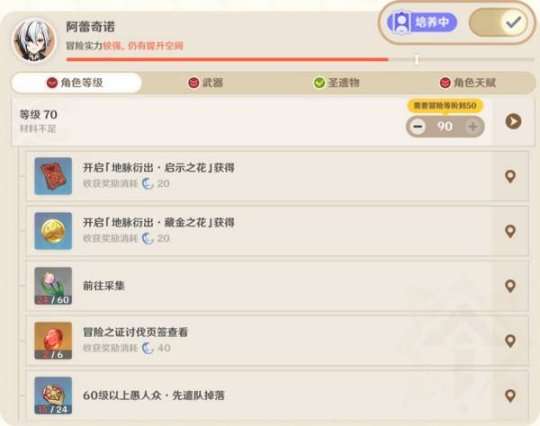 在设定好相应的培养计划后,达成既定目标所缺少的材料,其主要获取途径将会在「冒险之证」中优先展示,并附有特殊的角标提示。在纪行奖励、秘境入口等养成材料获取的常用界面也会出现相应的角标提示。