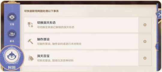 尘歌壶新增【阿圆】页签,页签内提供【切换洞天形态】、【制作摆设】、【洞天百宝】功能。版本更新后,旅行者可以随时打开尘歌壶完成以上操作,无需再去找阿圆对话。在室内也可以随时制作家具并买到需要的材料了。更多尘歌壶相关优化可以在5.4版本更新说明中查看。