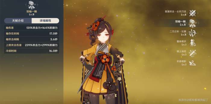 千织是一位五星岩系单手剑的角色,具有攻击和防御双重加成。虽然很少见到同时拥有这两种属性加成的角色,但千织的防御属性优于攻击属性,其防御加成比攻击加成更高(甚至圣遗物词条属性也更高)。