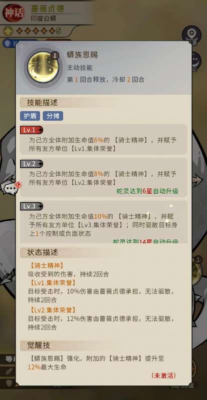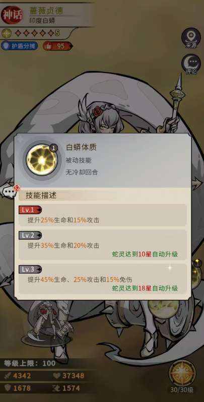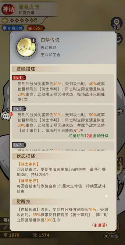 因为蔷薇贞德是印度白蟒的蛇灵,所以在这里被动的增益叫做白蟒体质,可以提升25%生命和15%攻击,在技能3级的时候提升的是45%生命、25%攻击和15%免伤。最后的白蟒传说被动技能,是蔷薇贞德受到伤害的时候,这里可以让分摊伤害降低40%,且同时有40%概率使目标附加【骑士审判】,如果是被攻击导致阵亡,那么此时可以立即复活且恢复自己的20%生命,这个效果跟起其他的复活效果一样直接无视灭魂状态,就是每场战斗只能触发1次。