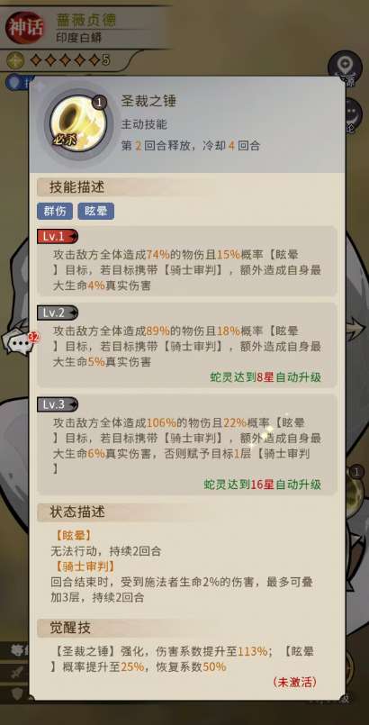 另外一个圣裁之锤技能可以造成的是群伤眩晕,蔷薇贞德会攻击敌方全体,对敌人造成74%的物伤且有15%概率可以施加【眩晕】给到供货价的目标,如果在这之前目标身上携带【骑士审判】,额外还可以造成蔷薇贞德最大生命4%的真实伤害,而在蔷薇贞德升级到16星的时候,此时就会攻击敌方全体造成106%的物理伤害,且其中有22%概率施加【眩晕】给这个目标,如果目标身上携带【骑士审判】,则会额外造成自身最大生命6%真实伤害,否则会带来1层【骑士审判】的效果,这里眩晕的效果会让敌人无法行动,而【骑士审判】的效果则是在每个蔷薇贞德行动的回合结束时,会受到施法者生命2%的伤害,觉醒之后的【圣裁之锤】在伤害数值上面提升至113%,而【眩晕】产生的概率提升至25%,恢复的数值达到50%。