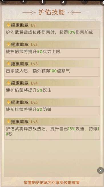 Lv1:提升护佑武将25%状态效果,可提高冻结、中毒灼烧、流血状态的命中几率
