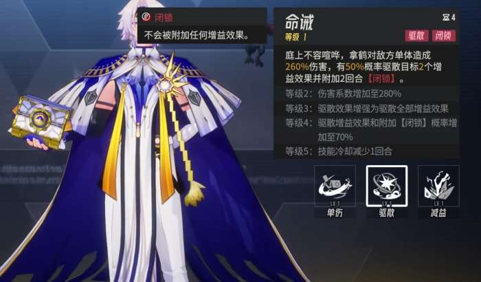 二技能命诫是拿鹤的核心技之一,能在驱散敌方单体目标两个增益buff的同时,对其造成倍率为260%的伤害,还能让目标在2回合内受到减益效果闭锁(无法被施加增益buff)的影响,触发概率为50%。是又又输出效果又强悍的技能,而且在AI操控时,他也能很智能选取合适的目标来进行驱散,基本上不会浪费掉该技能的驱散效果,所以在自动时也很好用。该技能提升至于等级3后会产生质变,原本能驱散2个增益的效果会改为驱散全部增益,效果更强,后续等级4还能提高施加闭锁的概率,等级5更能降低该技能的冷却,所以各位在有条件时可优先将该技能升满。
