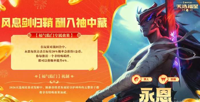 软件提交 专题合集 热门手游在2026天选福星恭喜发财模式中,五费卡永恩拥有专属【福气临门】效果:对局中,永恩每次击杀目标有20%概率获得1金币,且每激活一个非特殊羁绊,概率提升6%。羁绊越丰富,收益越可观。