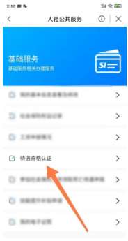 第二步:选择待遇资格认证功能在基础服务界面中,浏览功能列表,找到待遇资格认证选项并点击。系统将跳转至认证信息填写或确认页面。