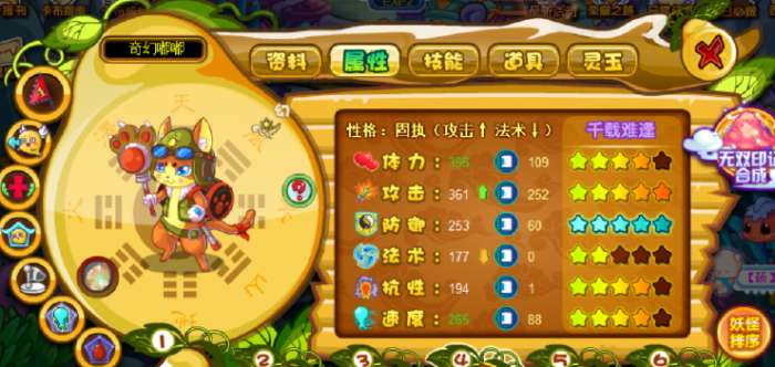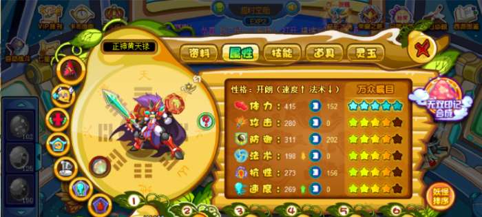 速度卡在265.体力400+,防御300+,剩下给抗性的正神黄天禄