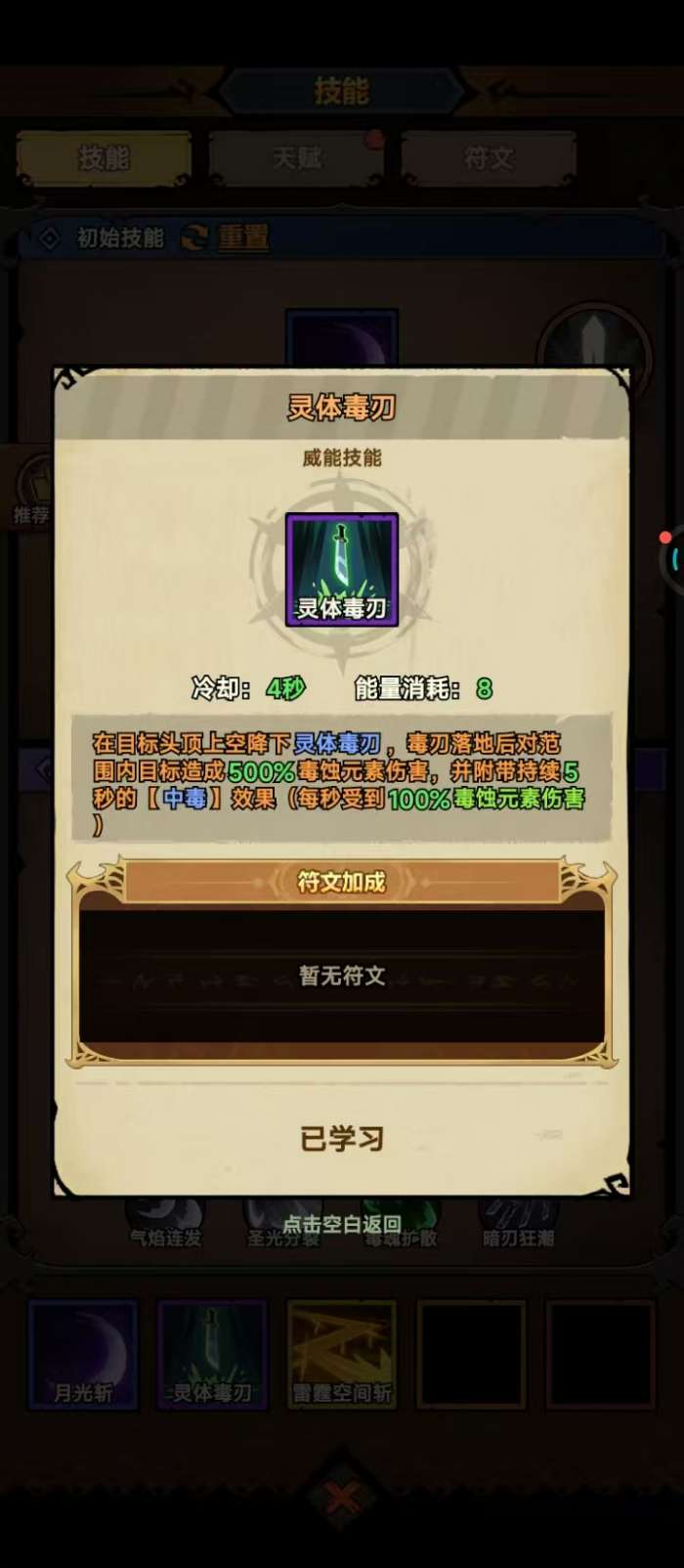 威能技能推荐唯一选择:灵体毒刃。该技能冷却4秒,消耗8点能量,造成500%倍率伤害,并附加5秒中毒效果。其单秒毒伤高于居合毒追,且拥有更宽松的判定范围,可有效弥补Boss位移导致的居合空挥问题。在居合毒追冷却间隙使用,能实现中毒无缝衔接。此外,技能树中可解锁“毒魂扩散”被动——当带有中毒状态的敌人死亡时,将爆发毒雾,对周围单位再次施加中毒,大幅提升群怪清场效率,尤其适用于副本多波次推进场景。