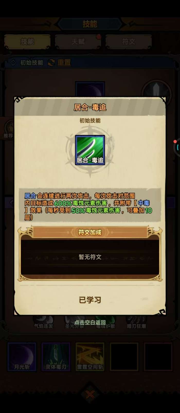 技能加点策略必须严格锁定毒系专精分支。初始技能栏仅保留月光斩、居合、居合追三项;冰霜连斩、居合暗破等非毒系分支不投入任何资源。重点强化居合毒追的攻击次数与单次伤害数值。主宰技能需分阶段配置:前期等级较低、中毒基础伤害不足时,优先选择裂霜延展,提供易伤减抗效果,显著提升中毒实际收益,助力平稳过渡;后期角色等级提升、属性成型后,切换为风行者,获得移动速度与攻速加成,既优化跑图效率,又增强Boss战中的机动追击能力。
