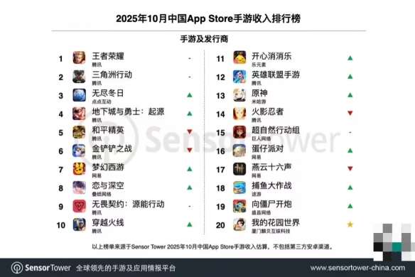 在中国App Store手游收入榜中,腾讯的《王者荣耀》和《三角洲行动》继续稳居冠亚军位置。受十一假期影响,《无尽冬日》在10月1日至8日期间收入环比激增60%,全月收入提升9%,排名升至收入榜第3名。米哈游的《原神》在10月中下旬推出新版本后,收入环比上涨46%,跻身收入榜第13名。