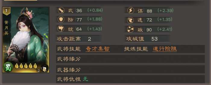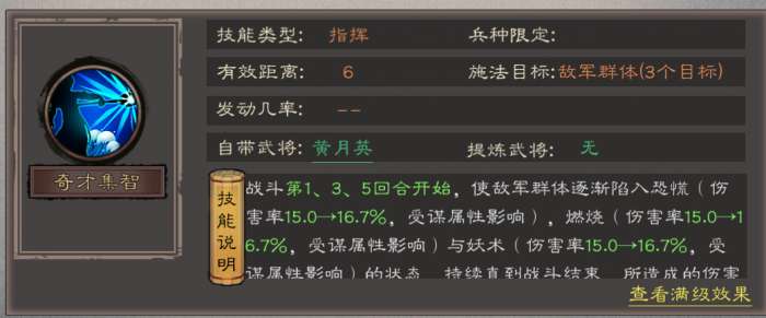 黄月英为蜀阵营辅助型谋士,核心依靠自带指挥技能「奇才集智」在战斗第1、3、5回合为敌军群体施加恐慌、燃烧、妖术持续伤害状态,同时自身政、谋属性优秀,可兼顾辅助与谋略输出,推荐站位为中军。