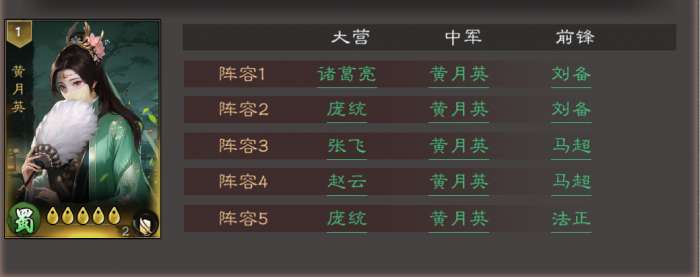 2、阵容2:大营庞统 + 中军黄月英 + 前锋刘备