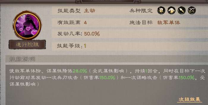 2、定位:主动型减益+输出技能,可降低敌军单体防、谋属性,同时触发兵刃与谋略双重攻击,属于功能型输出技能,适合补充单点伤害与属性压制。